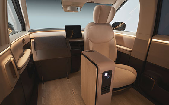 - The driver’s seat swivels to create a face-to-face space. With a fold-away table and screen, it can be used as a mobile workspace.