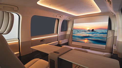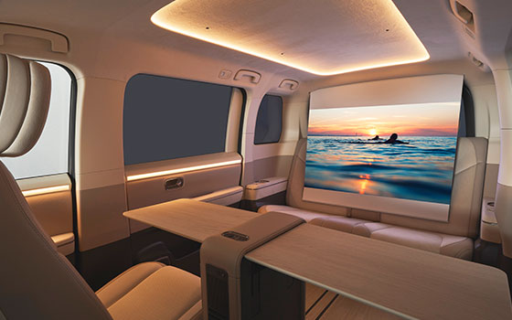 - With a retractable screen stored in the roof and a projector tucked inside the console box, the interior transforms into a theater.