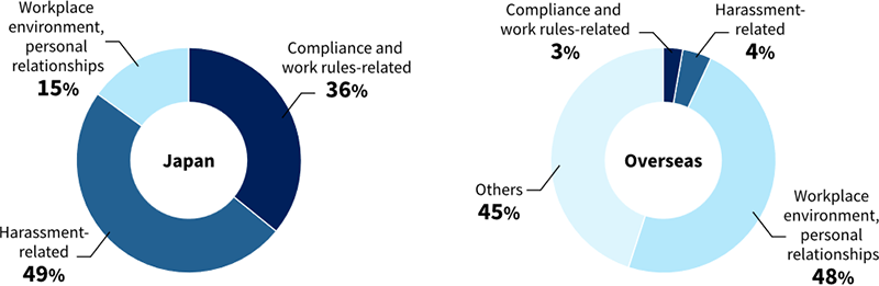 Hotlines have been set up at Sharp’s major overseas bases, with consideration for the legal system and other matters in each country. Action is taken to swiftly address any problems. In fiscal 2023, there were 92 reports.