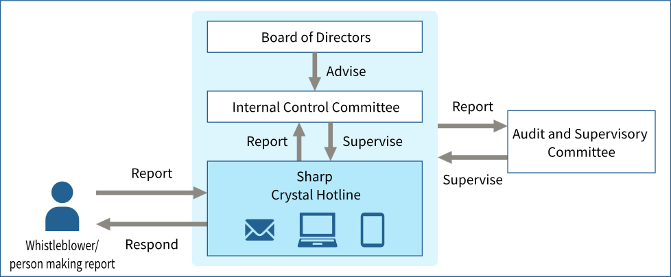 If a compliance-related risk occurs, Sharp will respond appropriately in accordance with the Basic Rules for Compliance and the Rules for Business Risk Management, and take comprehensive corrective measures and prevent recurrence.