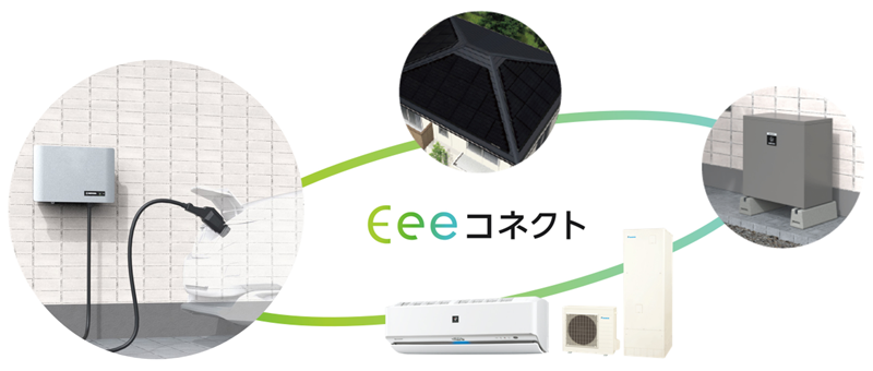 SESJ launched the JH-WE2301, the industry’s smallest and lightest*5 electric vehicle (EV) converter capable of charging and discharging EVs, and built a V2H system for connecting EVs to homes. In order to make effective use of solar power, SESJ began offering the Eee Connect system. As part of the Life Eee Connect service described above, it not only connects with storage batteries and home appliances but also connects with EVs.