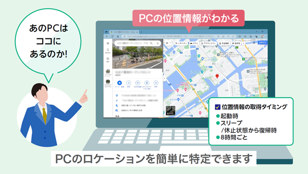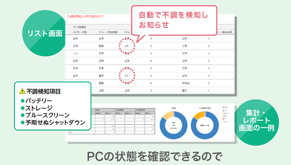 Dynabook’s original asset management ledger system makes it possible to manage PC users, location information, and status. The monitoring service facilitates more efficient PC operation through failure detection, which lets users check the status of their PCs via a portal so that they can ascertain in advance the number of spare machines required and to speed up the timing of PC procurement.