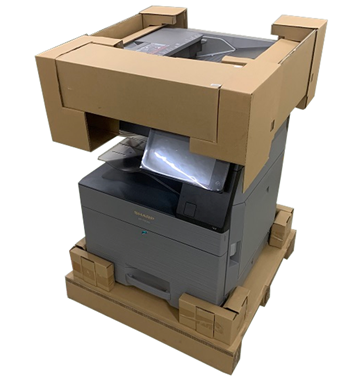 From March 2024, the Smart Business Solutions BU has reduced the weight of plastic packaging by 60% for Sharp’s flagship A3 color and B/W MFPs*4 for the Japanese market by switching from conventional plastic foam to corrugated cardboard for the cushioning material.