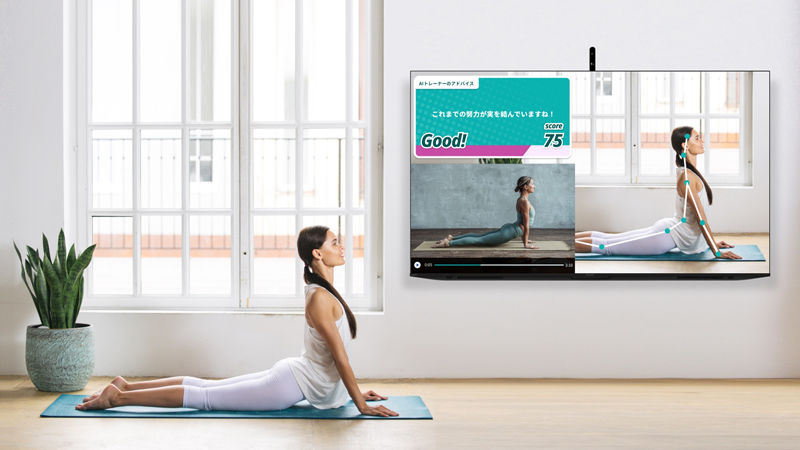 The TV Systems BU has developed a platform to be used with a large-screen TVs that can be easily adapted for a variety of applications, such as yoga, fitness, and frailty prevention exercises. Using generative AI to analyze posture in real-time based on images captured by a camera attached to the TV, an AI healthcare trainer provides advice to users.