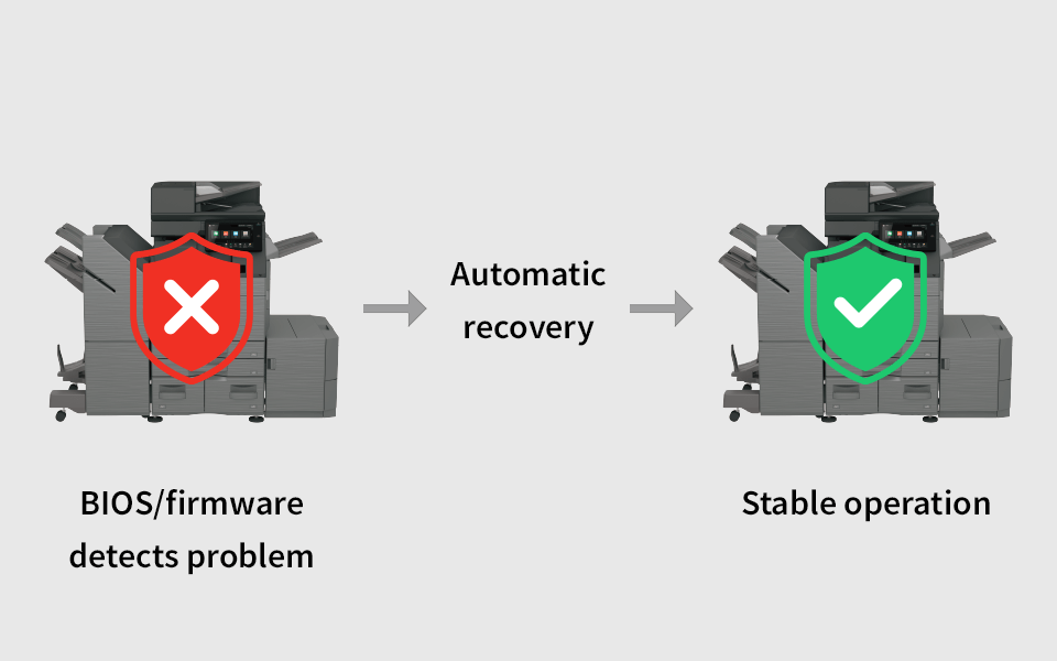 When booting up, the MFP checks for any anomalies in the BIOS/firmware. If it finds a problem, it aborts the startup and launches an automatic BIOS recovery. By verifying the firmware, the BIOS protects the MFP system. If there are other firmware-related issues, the MFP will attempt recovery to protect the system.
