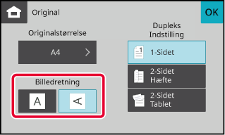 Efter at have trykket på tasten [Original], skal du trykke på tasten [2-Sidet Hæfte] eller [2-Sidet Tablet].