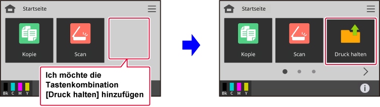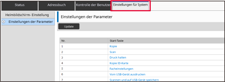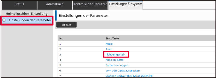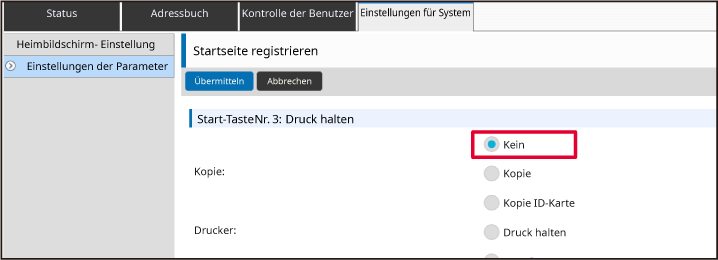 Für manche Einstellungen ist es ggf. erforderlich, Ihr Benutzerpasswort einzugeben, nachdem Sie auf [Heimbildschirm Einstellung] geklickt haben. Wenn Sie keine Benutzerauthentifizierung ausgeführt haben, müssen Sie das Administratorenpasswort eingeben.Klicken Sie auf [Einstellungen der Parameter] und dann auf die Schnellzugriffstaste die Sie hinzufügen möchten.