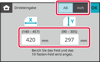 Berühren Sie die Taste [Direkteingabe], um einen numerischen Wert für das Format des eingelegten Papiers einzugeben. Berühren Sie nach dem Beenden der Einstellungen die Taste [OK].Version 04a / bp22c25_usr_04a_de