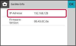Drucken Sie im Einstellungsmodus am Gerät die IP-Adresse des Geräts aus und geben Sie diese Adresse im Webbrowser am PC ein.