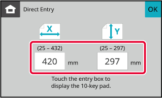 Tap the areas displaying width and height sizes respectively, and enter the sizes using the numeric keys.