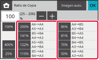 El porcentaje de reducción o ampliación se selecciona automáticamente según el tamaño del original y el tamaño de papel seleccionado.