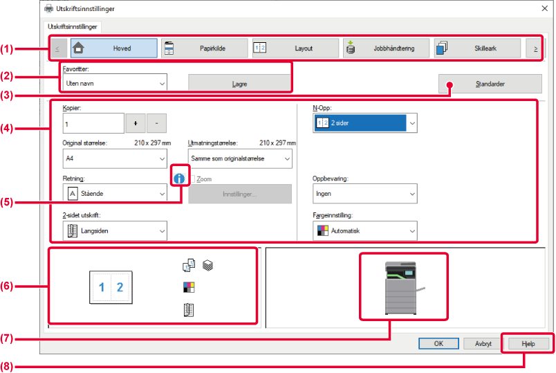 skriverdriveren består av 8 faner. Klikk på en fane for å velge