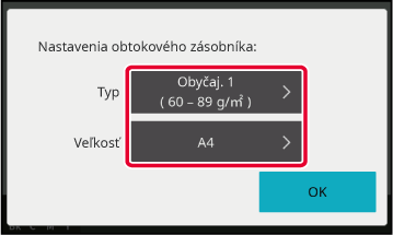 VKLADANIE PAPIERA DO BOČNÉHO PODÁVAČAZobrazí sa dialógové okno. Ak chcete zmeniť nastavenia, v dialógovom okne klepnite na položku [Typ] alebo [Veľkosť] a vyberte veľkosť a typ papiera.