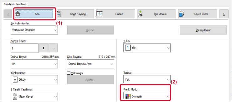Makine, her bir sayfanın siyah beyaz mı yoksa renkli mi olduğunu otomatik olarak algılar ve sayfayı ona göre yazdırır. Siyah beyaz dışındaki renkler bulunan sayfalar Y (Sarı), M (Macenta), C (Camgöbeği) ve Bk (Siyah) kullanılarak yazdırılır. Sadece siyah beyaz olan sayfalar sadece Bk (siyah) toner kullanılarak yazdırılır. Bu işlev, hem renkli hem siyah beyaz sayfaları bulunan bir belgeyi yazdırmak için uygun olmakla birlikte yazdırma hızı daha yavaştır. |