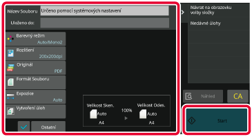 Vložte originál do zásobníku automatického podavače dokumentů nebo na sklo pro dokumenty.Zkontrolujte název souboru a místo uložení a u požadovaného nastavení klikněte na příslušnou klávesu.