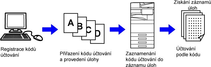 Slouží k rozdělení výsledků provedených úloh tisku a odeslání podle kategorií, což zefektivňuje správu. Můžete například přiřadit kód podle zákazníka a pomocí záznamů úloh získat informace o nákladech podle zákazníka. Příklad kódu: Vystavení pro společnost A |