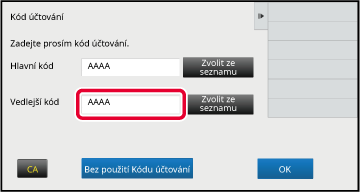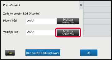 Znovu se zobrazí okno pro zadání kódu účtování.Klepněte na klávesu [Zvolit ze seznamu] vedlejšího kódu.