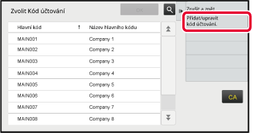 Tímto se dokončí registrace a znovu se zobrazí předchozí okno. Postup registrace dokončete klepnutím na ikonuKdyž je zobrazeno okno pro zadání kódu účtování, klepněte na klávesu [Zvolit ze seznamu] hlavního kódu.
