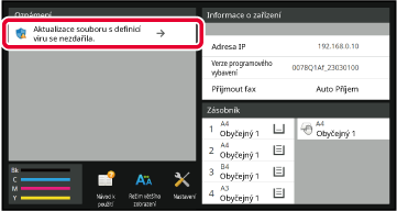 Aktualizace se zruší a na dotykovém panelu se zobrazí zpráva, že je aktualizovaný soubor poškozen. Poté, co uživatel potvrdí obsah a obrazovku zavře, přístroj bude fungovat s firmwarem ve stavu před aktualizací. Pokud byl firmware aktualizován dálkově, aktualizace se zruší a informace o detekci viru se zobrazí pod položkou „Oznámení“ na obrazovce Systémové informace. Přístroj bude fungovat s firmwarem ve stavu před aktualizací. |
