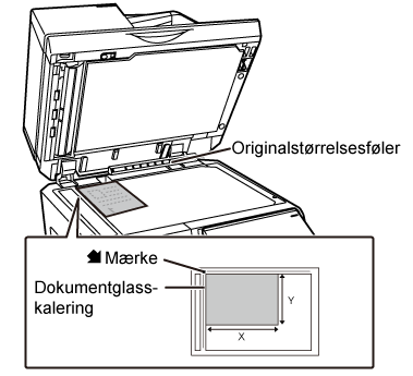 Læg originalen med forsiden nedad, og få originalens øverste venstre hjørne til at flugte med glaspladens bageste venstre hjørne (ved spidsen af mærketForsigtig