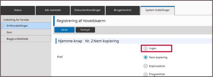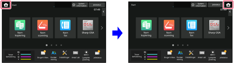 Skærmen skifter til indstillingsskærm.Tryk på [System Indstillinger] → [Indstilling for forside] og tryk dernæst på tasten [Placering af start-knap].