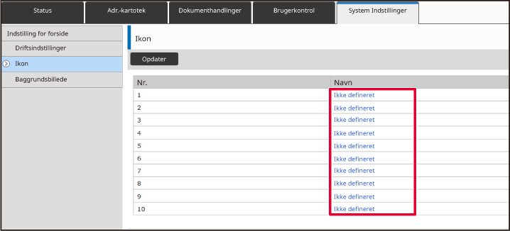 Ved nogle indstillinger kan det kræves, at du indtaster din brugeradgangskode, efter at du har klikket på [Indstilling for forside]. Hvis du ikke har udført brugergodkendelse, skal du indtaste administratoradgangskoden.Klik på [Ikon].