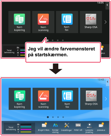 for hjemmeskærmen i maskinen. Du kan ændre farvemønsteret fra berøringspanelet.