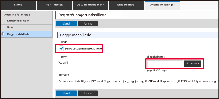 Klik på knappen [Gennemse], og vælg billedet, der skal bruges.Når konfigurationen af indstillingerne er udført, skal du klikke på knappen [Send].