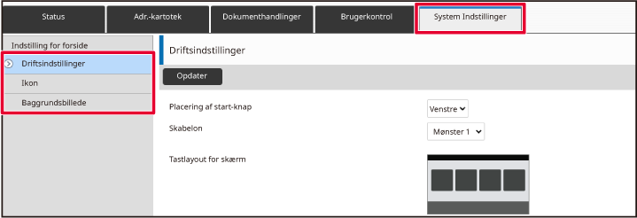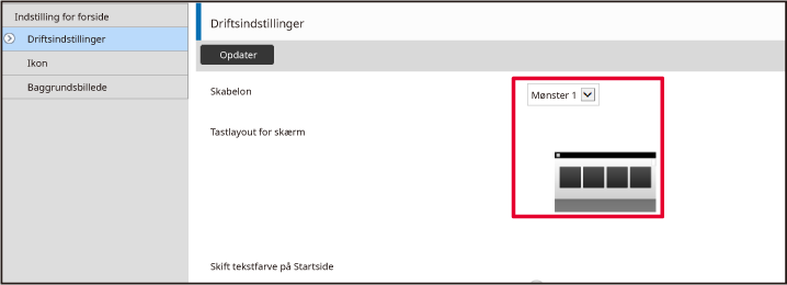 Ved nogle indstillinger kan det kræves, at du indtaster din brugeradgangskode, efter at du har klikket på [Indstilling for forside]. Hvis du ikke har udført brugergodkendelse, skal du indtaste administratoradgangskoden.Klik på [Driftsindstillinger], og vælg det ønskede layoutmønster fra "Skabelon".