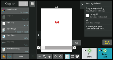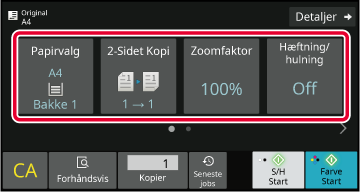 VALG AF PAPIRBAKKE TIL KOPIERINGAUTOMATISK TOSIDET KOPIERINGVÆLG AUTOMATISK FORHOLDOUTPUTKOPIFARVEFUNKTIONERVALG AF RETNING OG STØRRELSE