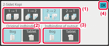 GRUNDLÆGGENDE FREMGANGSMÅDE FOR KOPIERINGVælg tosidet kopifunktion.