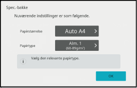 VALG AF PAPIRBAKKE TIL KOPIERINGTryk på tasten [Papirtype], tryk på tasten for den indstillede papirtype, og tryk derefter på tasten [OK].