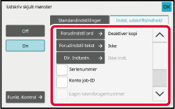 Når du vil angive udskriftsindstillinger, kan du vælge den ønskede indstilling ud fra en forindstillet tekst eller bruge softwaretastaturet. Du kan også udskrive serienummer og job-id for konto.Tryk på tasten [Farve Start] eller [S/H Start] for at starte kopieringen.