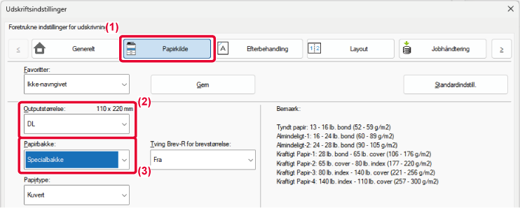 størrelsen og typen af det papir, der anvendes til udskrivning,