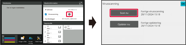 Når der registreres en virus i forbindelse med inputdata, vises det på berøringspanelet, at der er registreret en virus, inputdataene eller det job, der skal indlæses, annulleres, og de data eller jobdata, der skulle udskrives, kasseres. Data i datainputkilden (USB-hukommelse, ekstern server osv.) bliver ikke slettet. Når der registreres en virus i forbindelse med outputdataene, vises det på berøringspanelet, at der er registreret en virus, outputdataene eller det job, der skal udskrives, annulleres, og outputdataene eller jobdataene slettes. Meddelelsen om virusdetektion bliver vist i "Besked" på skærmen Systeminformation. |