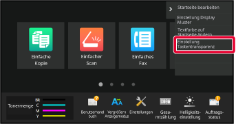 Für manche Einstellungen ist es ggf. erforderlich, Ihr Benutzerpasswort einzugeben, nachdem Sie auf [Heimbildschirm- Einstellung] geklickt haben. Wenn Sie keine Benutzerauthentifizierung ausgeführt haben, müssen Sie das Administratorenpasswort eingeben.Klicken Sie auf [Einstellungen der Parameter] und dann auf die Schaltfläche [Einstellung Tastentransparenz].