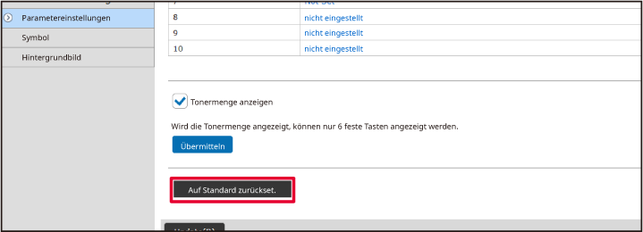 Für manche Einstellungen ist es ggf. erforderlich, Ihr Benutzerpasswort einzugeben, nachdem Sie auf [Heimbildschirm- Einstellung] geklickt haben. Wenn Sie keine Benutzerauthentifizierung ausgeführt haben, müssen Sie das Administratorenpasswort eingeben.Klicken Sie auf [Einstellungen der Parameter] und dann auf die Schaltfläche [Zurück auf Standard].