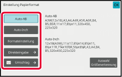 Beim Ändern der Papierart durch Berühren der Taste [Papierwahl], berühren Sie die Registerkarte [Art] und wählen Sie die Papierart.Berühren Sie die Taste [Grösse] und anschließend die Taste, die dem eingelegten Papierformat entspricht.