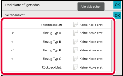 Um den Auftrag nach dem Ändern der Seitenansicht zu beenden, berühren Sie die Taste [OK].Ändern Sie die Einstellungen für das Deckblatt oder den Einzugsbogen.
