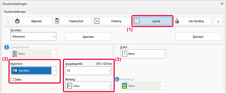 Wenn ein Heft-Finisher installiert und die Optionen "Broschüre"