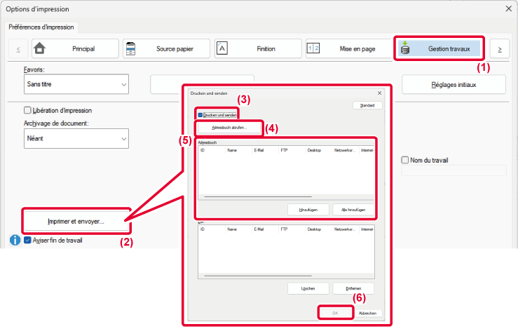 [Druckeroptionen] und dann [Auftragsabwicklung].