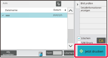 Es können mehrere Dateien ausgewählt werden. Die berührte Datei wird mit einem Häkchen gekennzeichnet. Um alle Dateien eines Ordners auszuwählen, berühren Sie die Taste [ALLE auswählen]. Um die ausgewählten Dateien zu löschen, berühren Sie die Taste [Löschen]. Wählen Sie eine der Dateien und berühren Sie im Aktionsfeld "Bild prüfen", um das Vorschaubild der Druckdaten zu prüfen. Die Ausführung des Vorschau-Bildschirms ist identisch mit der Methode zum Prüfen der Bilder in der Dokumentenablage. Siehe " BILDPRÜFUNG EINER DATEI" Sie können auch im Aktionsfeld "Detailinformationen anzeigen" berühren, um die detaillierten Informationen, wie z. B. die Druckgröße der Datei, zu prüfen. Wenn Sie eine Datei drucken möchten, fahren Sie mit dem nächsten Schritt fort.Bestätigen Sie die Druckeinstellungen und berühren Sie die Taste [Jetzt drucken].