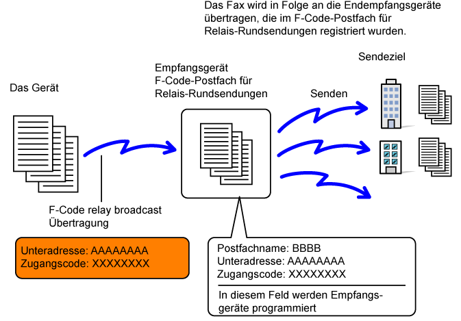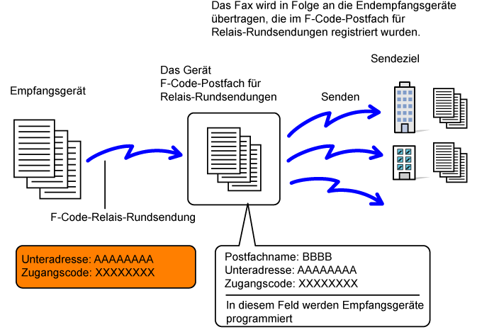 empfängt, wird das Fax im F-Code-Postfach für Relais-Rundsendungen