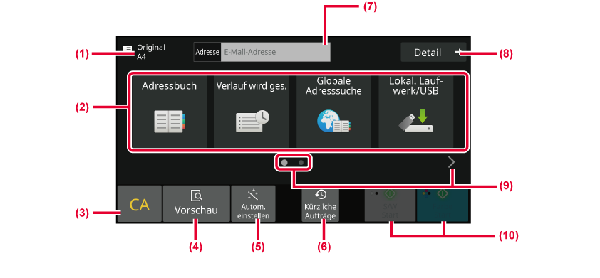 zu E-Mail" und "Scannen zu FTP". Das Layout des Ausgangsbildschirms