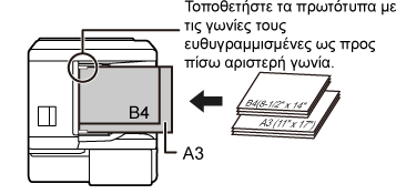 Αφού ολοκληρώσετε τις ρυθμίσεις, πατήστε διαδοχικά το πλήκτρο [OK] και το πλήκτρο [Προηγούμεν].Τοποθετήστε το πρωτότυπο με την όψη προς τα επάνω στον δίσκο του τροφοδότη πρωτοτύπων με τις γωνίες του ευθυγραμμισμένες προς την πίσω αριστερή γωνία.