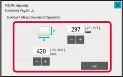 Αγγίξτε τις περιοχές στις οποίες εμφανίζονται τα μεγέθη πλάτους και ύψους αντίστοιχα και εισαγάγετε τα μεγέθη χρησιμοποιώντας τα αριθμητικά πλήκτρα.Πατήστε το πλήκτρο [OK].
