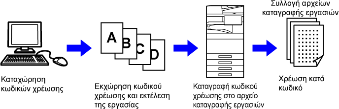 Χρησιμοποιείται για την ταξινόμηση των αποτελεσμάτων των εργασιών εκτύπωσης και αποστολής που έχουν εκτελεστεί, έτσι ώστε να είναι δυνατή η αποτελεσματική τους διαχείριση. Για παράδειγμα, μπορείτε να εκχωρήσετε έναν κωδικό κατά πελάτη και να συλλέξετε τις πληροφορίες δαπανών κατά πελάτη από τα αρχεία καταγραφής εργασιών. Παράδειγμα κωδικού: Έκδοση εταιρείας A |