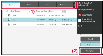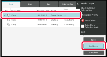 status, tap the [Spool], [Job Queue] or [Complete] key as desired.