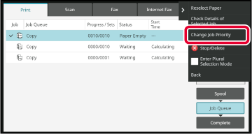 Tap the job for priority processing and then tap [Change Job Priority] on the action panel.