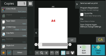 SELECTING THE PAPER TRAY FOR COPYINGAUTOMATIC 2-SIDED COPYINGAUTO RATIO SELECTOUTPUTCOPY COLOUR MODESSELECTING THE ORIENTATION AND